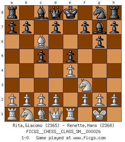 Last move : 1-0 2022 December 4 14:36:23 [Event "FICGS__CHESS__CLASS_SM__000026"] [Site "FICGS"] [Date "2022.10.23"] [Round "1"] [White "Rita,Giacomo"] [Black "Renette,Hans"] [Result "1-0"] [WhiteElo "2365"] [BlackElo "2368"] 1.e4 c5 2.Nf3 Nc6 3.Bb5 g6 4.O-O Bg7 5.Re1 e5 6.Bxc6 1-0 This chess game has been lost on time (started : 2022.10.23 16:12:58) Follow this game move after move (download)By this measure (on the gap between Fischer & his contemporaries), I consider him the greatest world champion. (Garry Kasparov) Spielt Blackmar-Diemer-Gambit, und das Matt kommt von selbst! (Emil Joseph Diemer) Evita las multitudes. Haz independientemente tu propio razonamiento. Trata de ser el jugador de Ajedrez, no la pieza de Ajedrez. (Ralph Charell) Pour moi, les échecs ne sont pas un jeu mais un art. (Alexandre Alekhine) The man who strikes first admits that his ideas have given out. (Chinese proverb)