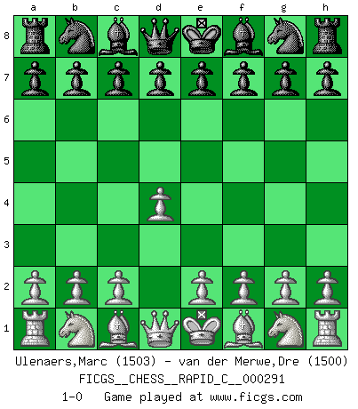 Last move : 1-0 2022 December 1 21:24:1 [Event "FICGS__CHESS__RAPID_C__000291"] [Site "FICGS"] [Date "2022.10.23"] [Round "1"] [White "Ulenaers,Marc"] [Black "van der Merwe,Dre"] [Result "1-0"] [WhiteElo "1503"] [BlackElo "1500"] 1.d4 1-0 This chess game has been lost on time (started : 2022.10.23 16:13:53) Follow this game move after move (download)Of Chess it has been said that life is not long enough for it, but that is the fault of life, not Chess. (William Ewart Napier) Offener Brief an US-Präsident Bush anlässlich der Verhaftung Bobby Fishers: Verhaften Sie mich. Stecken Sie mich in dieselbe Zelle wie Bobby Fisher und geben Sie uns ein Schachspiel mit. (Boris Vassilievich Spassky) Los libros de Ajedrez deben de usarse igual como usamos los anteojos: para mejorar la vista, aunque algunos jugadores los quieren usar como si ellos les otorgaran la vision. (José Raúl Capablanca) Votre prénom est 'Tactique', votre deuxième prénom est 'Tactique' et votre nom est 'Tactique'. (Ken Smith) The Internet is so big, so powerful and pointless that for some people it is a complete substitute for life. (Andrew Brown)
