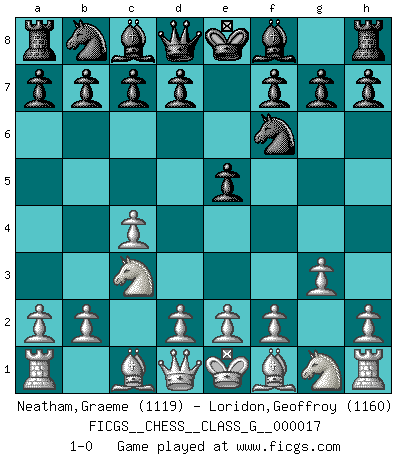 Last move : 1-0 2007 September 26 16:5:46 [Event "FICGS__CHESS__CLASS_G__000017"] [Site "FICGS"] [Date "2007.08.12"] [Round "1"] [White "Neatham,Graeme"] [Black "Loridon,Geoffroy"] [Result "1-0"] [WhiteElo "1119"] [BlackElo "1160"] 1.c4 e5 2.Nc3 Nf6 3.g3 1-0 This chess game has been lost on time (started : 2007.08.12 23:39:2) English : Carls' Bremen system Player White won this chess game. Follow this game move after move (download)Some sacrifices are sound; the rest are mine. (Mikhail Tal) Fischer machte Schach einfach zu einer aufregenden Sache, wann immer er sich ans Brett setzte. (Raymond Keene) Uno no tiene que jugar muy bien, es suficiente jugar mejor que el oponente. (Siegbert Tarrasch) RxDa4 pat (...) There are two types of people in this world, good and bad. The good sleep better, but the bad seem to enjoy the waking hours much more. (Woody Allen)