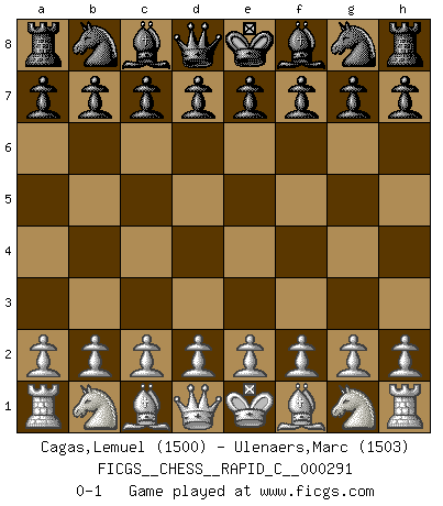 Last move : 0-1 2022 November 23 1:37:59 [Event "FICGS__CHESS__RAPID_C__000291"] [Site "FICGS"] [Date "2022.10.23"] [Round "1"] [White "Cagas,Lemuel"] [Black "Ulenaers,Marc"] [Result "0-1"] [WhiteElo "1500"] [BlackElo "1503"] 0-1 This chess game has been lost on time (started : 2022.10.23 16:13:53) Follow this game move after move (download)The passed Pawn is a criminal, who should be kept under lock and key. Mild measures, such as police surveillance, are not sufficient. (Aaron Nimzovich) Die Idee von Capablanca, Schach als Fach in den Schulen zu lehren, ist großartig. (Fidel Castro) En la perfecta combinación de Ajedrez como en una historia corta de primera clase, toda la trama y contra trama deberá conducir hacia un final sorprendente, el interes no es mitigado hasta el último momento. (Yates and Winter) A ce moment-là, je menaçais de comprendre la position ! (Clément L'Heureux) Knowledge will give you power, but character respect. (Bruce Lee)