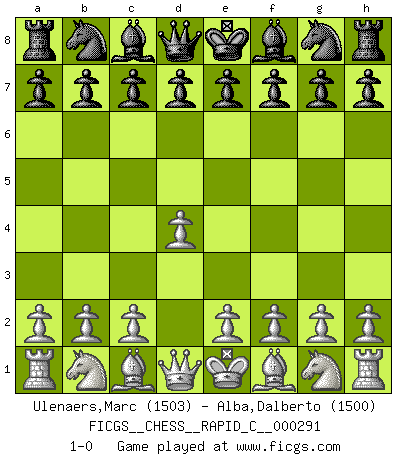 Last move : 1-0 2022 December 1 21:24:1 [Event "FICGS__CHESS__RAPID_C__000291"] [Site "FICGS"] [Date "2022.10.23"] [Round "1"] [White "Ulenaers,Marc"] [Black "Alba,Dalberto"] [Result "1-0"] [WhiteElo "1503"] [BlackElo "1500"] 1.d4 1-0 This chess game has been lost on time (started : 2022.10.23 16:13:53) Follow this game move after move (download)Chess, like any creative activity, can exist only through the combined efforts of those who have creative talent, and those who have the ability to organize their creative work. (Mikhail Botvinnik) Frage des Reporters: -Worin besteht das Ziel von Gambiteröffnungen? Antwort: -Auf Kosten der Partie einen Ruf als Angriffspieler zu erwerben.- (Siegbert Tarrasch) Al jugar al Ajedrez entonces, podemos aprender: Primero: Previsión... Segundo: Prudencia... Tercero: Cautela... Y al final, aprendemos del Ajedrez el hábito de no ser desanimados por apariencias malas presentes en el estado de nuestros asuntos, el hábito de la esperanza por una oportunidad favorable y la perseveración de los secretos de los recursos. (Benjamin Franklin) Pour se monter efficace, un Cavalier a besoin d'avant-postes ! Les Cavaliers font les meilleurs bloqueurs de pions passés. There is no vagueness without wind. (Chinese proverb)