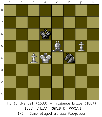 Last move : 1-0 2022 November 24 13:24:31 [Event "FICGS__CHESS__RAPID_C__000291"] [Site "FICGS"] [Date "2022.10.23"] [Round "1"] [White "Pintor,Manuel"] [Black "Trigance,Emile"] [Result "1-0"] [WhiteElo "1693"] [BlackElo "1864"] 1.e4 a6 2.f4 e5 3.Nf3 exf4 4.Bc4 d6 5.O-O Be7 6.d4 g5 7.Nc3 Nc6 8.Nd5 h5 9.c3 f6 10.e5 dxe5 11.dxe5 fxe5 12.Nxe7 Qxe7 13.Bd5 Bd7 14.Bxc6 Bxc6 15.Nxe5 Qxe5 16.Re1 Be4 17.Qa4+ b5 18.Rxe4 bxa4 19.Rxe5+ Kd7 20.Rxg5 Rf8 21.Kf2 Rh7 22.Ra5 Rh6 23.Rxa4 Rhf6 24.Ra5 f3 25.g3 Re6 26.Bf4 h4 27.Kxf3 hxg3 28.hxg3 Ne7 29.Rd1+ Kc8 30.b4 Ng6 31.R1d5 Ne7 32.Re5 Rxe5 33.Rxe5 Nc6 34.Rc5 Kb7 35.a4 Rf7 36.b5 axb5 37.axb5 Nd8 38.Re5 Kb6 39.c4 Nb7 40.Ke4 Nc5+ 41.Kd4 Rd7+ 42.Rd5 c6 43.bxc6 Kxc6 44.Rxd7 Nxd7 45.g4 Nf8 46.Be5 Ne6+ 47.Kc3 Kc5 48.Bf6 Nf4 49.Be7+ Kc6 50.Kd4 Kd7 51.Bf6 Kc6 52.g5 Kd6 53.Be5+ 1-0 Follow this game move after move (download)After black's reply to 1.e4 with 1..e5, leaves him always trying to get into the game. (Howard Staunton) Jeder leidlich begabte Spieler, er braucht keineswegs hervorragend veranlagt zu sein, kann es zum Meister bringen. Aber das ist ja auch gar nicht nötig! Der richtige Standpunkt ist es, zu seinem Vergnügen zu spielen, und man glaube ja nicht, dass der Genuss proportional dem Können sei. (Siegbert Tarrasch) El Ajedrez, como cualquier actividad creativa, solo puede existir a través del esfuerzo combinado de aquellos que tienen talento creativo y de aquellos que poseen la habilidad de organizar su trabajo creativo. (Mikhail Botvinnik) Les échecs, c'est l'art d'analyser. (Mikhail Botvinnik) Every man's memory is his private literature. (Aldous Huxley)