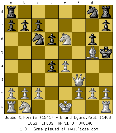 Last move : 1-0 2022 November 16 2:55:59 [Event "FICGS__CHESS__RAPID_D__000146"] [Site "FICGS"] [Date "2022.10.23"] [Round "1"] [White "Joubert,Hennie"] [Black "Brand Lyard,Paul"] [Result "1-0"] [WhiteElo "1541"] [BlackElo "1408"] 1.e4 e5 2.Bc4 Bc5 3.d4 exd4 4.Bxf7+ Kxf7 5.Qh5+ g6 6.Qxc5 Nc6 7.Nf3 d6 8.Qc4+ Be6 9.Ng5+ Kf6 10.Qxe6+ Kg7 11.Qf7+ Kh6 12.Ne6 Qg5 13.Bxg5+ Kh5 14.Qf3+ 1-0 Follow this game move after move (download)I guess a certain amount of temperament is expected of Chess geniuses. (Ron Gross) Mit sehr nachdenklichem Gesicht schreitet Bobby durch den Turniersaal. Was ist passiert?, fragt Lombardy. Ich stehe schlecht, antwortet Fischer. Lombardy: Dann biete doch einfach Remis an. Fischer: So schlecht stehe ich nun auch wieder nicht! (Robert James Fischer) No es suficiente ser un buen jugador, se debe también de jugar bién. (Siegbert Tarrasch) Le jeu d'échecs fait naître et fortifie en nous plusieurs qualités précieuses dans le cours de l'existence, telles que la prévoyance, la circonspection, la prudence, et la persévérance. (Benjamin Franklin - 1783, la morale des échecs) In every real man a child is hidden that wants to play. (Friedrich Nietzsche)