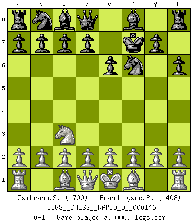 Last move : 0-1 2022 November 28 12:11:58 [Event "FICGS__CHESS__RAPID_D__000146"] [Site "FICGS"] [Date "2022.10.23"] [Round "1"] [White "Zambrano,Salvatore"] [Black "Brand Lyard,Paul"] [Result "0-1"] [WhiteElo "1700"] [BlackElo "1408"] 1.Nf3 Nf6 2.Nc3 e6 3.Ng5 h6 4.Nxf7 Kxf7 0-1 This chess game has been lost on time (started : 2022.10.23 19:28:10) Follow this game move after move (download)Adequate compensation for a sacrifice is having a sound combination leading to a winning position; adequate compensation for a blunder is having your opponent snatch defeat from the jaws of victory. (Bruce A. Moon) Ich kenne keine einzige Person, die behaupten würde, Garri Kasparow sei ein guter Mensch (Nigel Short) Hay jugadores fuertes y personas amables y yo soy un jugador fuerte. (Bobby Fischer) A ce moment-là, je menaçais de comprendre la position ! (Clément L'Heureux) Happy endings are just stories that haven't finished yet. (Jane Smith in Mr & Mrs Smith)