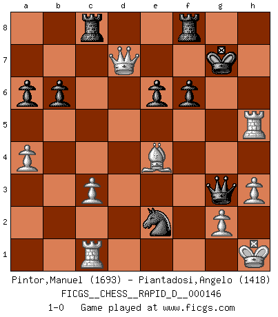 Last move : 1-0 2022 November 29 23:6:35 [Event "FICGS__CHESS__RAPID_D__000146"] [Site "FICGS"] [Date "2022.10.23"] [Round "1"] [White "Pintor,Manuel"] [Black "Piantadosi,Angelo"] [Result "1-0"] [WhiteElo "1693"] [BlackElo "1418"] 1.e4 c5 2.f4 d6 3.Nf3 e6 4.Bc4 Nf6 5.d3 Be7 6.e5 dxe5 7.fxe5 Nfd7 8.O-O O-O 9.Kh1 b6 10.Nc3 Bb7 11.Qe2 Nc6 12.h3 a6 13.a4 Rc8 14.Ne4 Ndxe5 15.Nxe5 Nxe5 16.Bb3 c4 17.dxc4 Bxe4 18.Qxe4 Bf6 19.c3 Qc7 20.Bf4 Qc6 21.Qe2 Nxc4 22.Bh6 Bxc3 23.bxc3 gxh6 24.Rf6 Qd5 25.Rxh6 Qg5 26.Rh5 Qg6 27.Bc2 Qg3 28.Bxh7+ Kg7 29.Rf1 Ne3 30.Rc1 Nd5 31.Qd2 Nf4 32.Qd4+ f6 33.Be4 Ne2 34.Qd7+ 1-0 Follow this game move after move (download)Daring ideas are like Chess men moved forward. They may be beaten, but they may start a winning game. (Johann Wolfgang von Goethe) Schach ist Kampf, hauptsächlich jedoch gegen die eigenen Fehler. (Savielly Grigorievitsch Tartakower) El jugador táctico sabe que hacer cuando hay algo que hacer; mientras que el estratega sabe que hacer cuando no hay nada que hacer. (Gerald Abrahams) Mais n'est-ce pas déjà le limiter injurieusement que d'appeler les échecs un jeu? N'est-ce pas aussi une science, un art, ou quelque chose qui, comme le cercueil de Mahomet entre ciel et terre, est suspendu entre l'un et l'autre, et qui réunit un nombre incroyable de contraires ? (Stefan Zweig) Computer Science is no more about computers than astronomy is about telescopes. (Edsger W. Dijkstra)