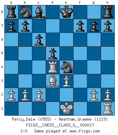 Last move : 1-0 2007 November 15 19:15:0 [Event "FICGS__CHESS__CLASS_G__000017"] [Site "FICGS"] [Date "2007.08.12"] [Round "1"] [White "Percy,Dale"] [Black "Neatham,Graeme"] [Result "1-0"] [WhiteElo "0955"] [BlackElo "1119"] 1.e4 c6 2.d3 e5 3.Nf3 Nf6 4.Nxe5 Qa5+ 5.Bd2 Qxe5 6.Na3 Bxa3 7.Rb1 Bc5 8.d4 Qxd4 9.Be3 Qxd1+ 10.Rxd1 Bxe3 11.fxe3 Nxe4 12.Rd4 d5 13.Bd3 1-0 This chess game has been lost on time (started : 2007.08.12 23:39:2) Caro-Kann : Closed (Breyer) variation Player White won this chess game. Follow this game move after move (download)It is no time to be playing Chess when the house is on fire. (Italian Proverb) Charakterschwächen offenbaren sich normalerweise während einer Schachpartie. (Garry Kasparov) Aún el Rey más flojo huye despavorido ante la amenaza de un Jaque doble. (Aaron Nimzowitsch) Donnez-moi un Cavalier en 6e et je gagnerais toutes mes parties. (Steinitz) Hold em is to stud what chess is to checkers. (Johnny Moss)