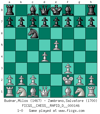 Last move : 1-0 2022 November 30 4:20:22 [Event "FICGS__CHESS__RAPID_D__000146"] [Site "FICGS"] [Date "2022.10.23"] [Round "1"] [White "Budnar,Milos"] [Black "Zambrano,Salvatore"] [Result "1-0"] [WhiteElo "1467"] [BlackElo "1700"] 1.e4 Nc6 2.d4 Nf6 3.e5 Ne4 4.f3 Nf2 5.Kxf2 1-0 This chess game has been lost on time (started : 2022.10.23 19:28:10) Follow this game move after move (download)Fischer was a master of clarity and a king of artful positioning. His opponents would see where he was going but were powerless to stop him. (Bruce Pandolfini) Kein Schachspieler kann gut schlafen. (H. G. Wells) Hay jugadores fuertes y personas amables y yo soy un jugador fuerte. (Bobby Fischer) Votre prénom est 'Tactique', votre deuxième prénom est 'Tactique' et votre nom est 'Tactique'. (Ken Smith) Everybody lies. (Gregory House, House M.D.)