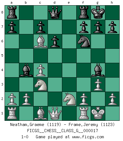 Last move : 1-0 2007 September 27 19:47:53 [Event "FICGS__CHESS__CLASS_G__000017"] [Site "FICGS"] [Date "2007.08.12"] [Round "1"] [White "Neatham,Graeme"] [Black "Frame,Jeremy"] [Result "1-0"] [WhiteElo "1119"] [BlackElo "1123"] 1.c4 e5 2.Nc3 Nf6 3.g3 Bc5 4.e3 Nc6 5.Bg2 O-O 6.Nge2 d6 7.O-O Be6 8.d4 exd4 9.exd4 Bb4 10.d5 Bg4 11.dxc6 bxc6 12.Bxc6 1-0 English : Carls' Bremen system Kingside Castling by player Black (move 5) Kingside Castling by player White (move 7) Player White won this chess game. Follow this game move after move (download)Pawn endings are to Chess what putting is to golf. (Cecil Purdy) Über Frauen: Chess is better. (Robert James Fischer) Muchos jugadores de Ajedrez se sorprendían cuando después de la partida, Fischer explicaba con calma: 'Yo ya había analizado esta posibilidad' en una posición en la cual yo creía que no era posible de prever desde la apertura. (Mikhail Tal) Il (Jacob Murray) ne joue pas pour le bon coup, mais pour le meilleur. (Eloi Relange) Over-the-board chess is the favorite of mortals, correspondence chess is the favorite of the gods. (Eduard Dyckhoff)