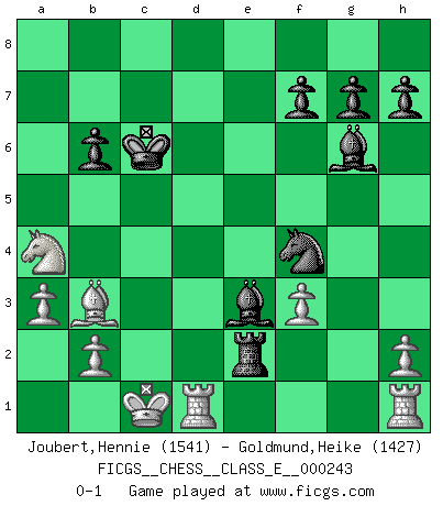 Last move : 0-1 2023 February 6 19:44:44 [Event "FICGS__CHESS__CLASS_E__000243"] [Site "FICGS"] [Date "2022.10.25"] [Round "1"] [White "Joubert,Hennie"] [Black "Goldmund,Heike"] [Result "0-1"] [WhiteElo "1541"] [BlackElo "1427"] 1.e4 d5 2.exd5 Qxd5 3.d4 e5 4.Nc3 Qxd4 5.Qxd4 exd4 6.Nb5 c5 7.Nc7+ Kd8 8.Nxa8 Nc6 9.Bf4 Be7 10.Nc7 Bf5 11.O-O-O Nf6 12.Bc4 b6 13.Nb5 Nb4 14.Bb3 Ne4 15.Rf1 Bg6 16.f3 Nf6 17.Nxa7 Kd7 18.Nb5 Rc8 19.c3 Nd3+ 20.Kd2 Nxf4 21.cxd4 Nxg2 22.Ne2 cxd4 23.Nexd4 Nh5 24.Ne2 Bb4+ 25.Nbc3 Nhf4 26.Nxf4 Nxf4 27.a3 Bc5 28.Na4 Rd8 29.Rd1 Kc6 30.Ke1 Re8+ 31.Kd2 Re2+ 32.Kc1 Be3+ 0-1 Follow this game move after move (download)At this time Fischer is simply a level above all the best Chessplayers in the world. (John Jacobs) Ich bin stolz ein Bulgare zu sein. (Veselin Topalov) Una de estas pequeñas movidas modestas pudieran ser mas molestas a tu oponente que la amenaza mas grande. (Siegbert Tarrasch) Le système Elo représente seulement une moyenne. Il est simplement un indicateur de votre stabilité. (Anatoli Karpov) Life is the sum of all your choices. (Albert Camus)