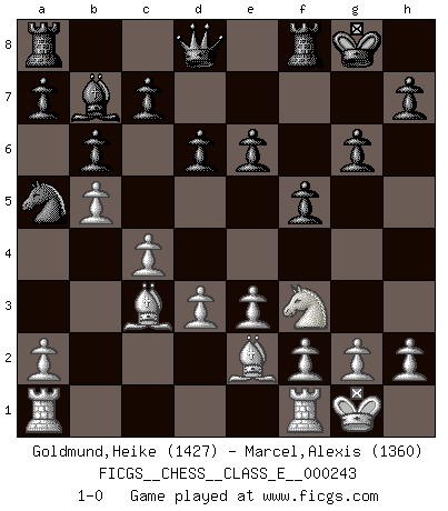Last move : 1-0 2023 January 25 15:19:24 [Event "FICGS__CHESS__CLASS_E__000243"] [Site "FICGS"] [Date "2022.10.25"] [Round "1"] [White "Goldmund,Heike"] [Black "Marcel,Alexis"] [Result "1-0"] [WhiteElo "1427"] [BlackElo "1360"] 1.b4 f5 2.Bb2 Nf6 3.e3 g6 4.c4 Bg7 5.Qb3 O-O 6.Nf3 e6 7.Be2 b6 8.d3 Bb7 9.O-O Nc6 10.b5 Na5 11.Qc3 Ne8 12.Nbd2 Bxc3 13.Bxc3 Nd6 14.Ne5 Nf7 15.Ndf3 Nxe5 16.Bxe5 d6 17.Bc3 1-0 Follow this game move after move (download)A great player and a great example for many. His book My 60 Memorable Games had a big impact on me. It is a shame he didn't continue to enrich the world of chess with his unparalleled understanding after 1972. (Jan Timman, about Bobby Fischer's death) Warum muß ich gegen diesen IDIOTEN verlieren? (Aaron Nimzowitsch) Dejen al perfeccionista jugar por correo. (Yasser Seirawan) On entre au jeu d'Echecs comme on entre en Religion. Pour le joueur d'Echecs, la partie d'Echecs c'est l'office, la messe, le défilé du 1er Mai, le dépôt de gerbe au Monument aux Morts. C'est un drame sacré. (Michel Roos) If computers get too powerful, we can organize them into committees. That'll do them in. (Anonymous)