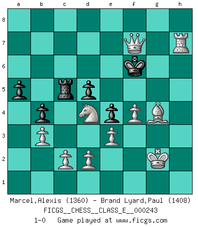 Last move : 1-0 2022 November 2 11:47:31 [Event "FICGS__CHESS__CLASS_E__000243"] [Site "FICGS"] [Date "2022.10.25"] [Round "1"] [White "Marcel,Alexis"] [Black "Brand Lyard,Paul"] [Result "1-0"] [WhiteElo "1360"] [BlackElo "1408"] 1.f4 d5 2.Nf3 Bg4 3.e3 c6 4.b3 h5 5.Bb2 e6 6.Be2 Bxf3 7.Bxf3 g6 8.Bxh8 f6 9.O-O Nh6 10.Nc3 Be7 11.Bg7 Nf5 12.Bh8 Kd7 13.Bxf6 Bxf6 14.Qe2 Bh4 15.g4 Ng3 16.hxg3 Bxg3 17.gxh5 Qh4 18.hxg6 Bh2+ 19.Qxh2 Qxh2+ 20.Kxh2 Kd6 21.Rh1 Nd7 22.Rag1 Rg8 23.Bh5 Nf6 24.Bf3 b5 25.Rg3 b4 26.Ne2 a5 27.Kg2 c5 28.g7 e5 29.Rg6 e4 30.Bg4 c4 31.Rxf6+ Ke7 32.Re6+ Kf7 33.Rh7 cxb3 34.axb3 Rc8 35.Nd4 Rc5 36.Rg6 Kxg6 37.g8Q+ Kf6 38.Qf7+ 1-0 Follow this game move after move (download)On the chessboard, lies and hypocrisy do not survive long. (Emanuel Lasker) Wer mein Gambit spielt, muß bereit sein, alle Brücken hinter sich abzubrechen. Es verändert den ganzen Menschen. Es wirkt wie ein Zauberstab und fördert verkümmerte, gute Charakter- eigenschaften wieder zu Tage. (Emil Joseph Diemer) Realmente no sabemos como el juego fue inventado, aunque hay sospechas. Tan pronto como descubramos a los culpables, se los haremos saber. (Bruce Pandolfini) En blitz, le Cavalier l'emporte sur le Fou. (Vlastimil Hort) . 'gn is not allowed in chess unless n is an integer between 1 and 8 inclusive, where 1 and 8 are to interpreted as the standard numerals standing for integers in the ordered real-closed field R, with the *canonical* ordering. (As opposed to, say, an integer in the domain Z[2+i*sqrt(5)] or an integer in some exotic Grothendieck topos). (Normajean Yates)