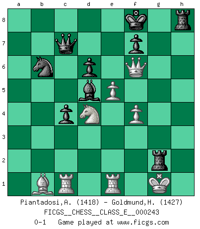 Last move : 0-1 2023 January 4 0:26:18 [Event "FICGS__CHESS__CLASS_E__000243"] [Site "FICGS"] [Date "2022.10.25"] [Round "1"] [White "Piantadosi,Angelo"] [Black "Goldmund,Heike"] [Result "0-1"] [WhiteElo "1418"] [BlackElo "1427"] 1.d4 Nf6 2.c4 b6 3.Nc3 Bb7 4.Nf3 e6 5.Bg5 Be7 6.e3 c5 7.Bd3 d6 8.O-O O-O 9.Rc1 Nbd7 10.Bh4 a6 11.Bg3 Nh5 12.d5 Nxg3 13.hxg3 exd5 14.cxd5 Nf6 15.e4 Re8 16.Re1 Ng4 17.Nh2 Ne5 18.Bb1 Bg5 19.f4 Bxf4 20.gxf4 Nc4 21.Nf3 Nxb2 22.Qc2 Nc4 23.Qb3 b5 24.a4 Qa5 25.axb5 axb5 26.Nxb5 Nb6 27.Nc7 c4 28.Qc2 Qc5+ 29.Kh1 Qxc7 30.e5 Bxd5 31.Qxh7+ Kf8 32.Qh8+ Ke7 33.Qxg7 Rh8+ 34.Kg1 Rag8 35.Qf6+ Kf8 36.Nd4 Rxg2+ 0-1 Follow this game move after move (download)The defensive power of a pinned piece is only imaginary. (Aaron Nimzovich) Garry Kasparov war erst in der Großmeister-Organisation GMA, dann in der Profischach-Vereinigung PCA, zum Schluss kehrte er wieder in den Schoß der FIDE zurück. Aber gut, manche Leute sind flexibel (Viswanathan Anand) El Ajedrez es un terrible juego. Si no controlas el centro, tu oponente tiene una posición mas holgada. Si tienes control del centro, ¡entonces realmente tu tienes algo de que preocuparte!. (Siegbert Tarrasch) Les Echecs ne sont pas pour les âmes timides. Ils requièrent un homme entier, qui ne s'arrête pas aveuglément à ce qui a été déjà établi, mais qui tente individuellement de sonder les profondeurs du jeu. (W. Steinitz) The smarter you play, the luckier you'll be. (Mark Pilarski)