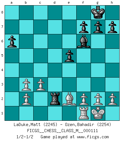 Last move : 1/2-1/2 2022 December 9 5:0:21 [Event "FICGS__CHESS__CLASS_M__000111"] [Site "FICGS"] [Date "2022.10.26"] [Round "1"] [White "LaDuke,Matt"] [Black "Ozen,Bahadir"] [Result "1/2-1/2"] [WhiteElo "2245"] [BlackElo "2254"] 1.e4 c5 2.Nf3 d6 3.d4 cxd4 4.Nxd4 Nf6 5.Nc3 a6 6.Be2 e5 7.Nf3 Be7 8.Bg5 Be6 9.Bxf6 Bxf6 10.O-O O-O 11.Qd2 Qc7 12.Nd5 Bxd5 13.Qxd5 Nd7 14.c3 Qc6 15.Qxc6 bxc6 16.Nd2 Nc5 17.Rad1 d5 18.exd5 cxd5 19.Nb3 Nxb3 20.Rxd5 Rfd8 21.Rxd8+ Rxd8 22.axb3 Rd2 1/2-1/2 Follow this game move after move (download)Let the perfectionist play postal. (Yasser Seirawan) Wenn Capablanka heute auf der Schachbühne erscheinen würde, hätte er ein halbes Jahr gebraucht um sich die Schachtheorie anzueignen. Und dann hätte er alles und jeden besiegt. (Mikhail Moiseyevich Botvinik) La vida es como un juego de Ajedrez, cambiando con cada movimiento. (Proverbio Chino) Aidez vos pièces, elles vous aideront. (Paul Morphy) Whenever people agree with me, I always feel I must be wrong. (Oscar Wilde)