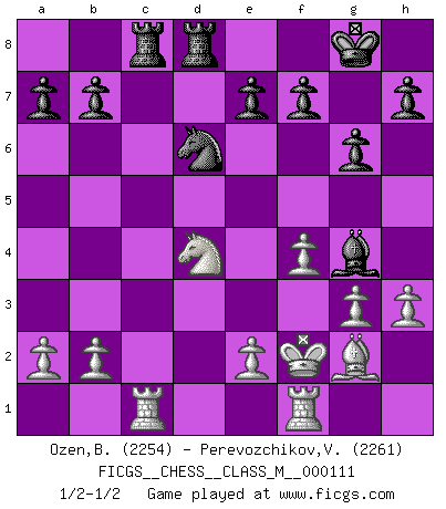 Last move : 1/2-1/2 2022 November 13 19:59:29 [Event "FICGS__CHESS__CLASS_M__000111"] [Site "FICGS"] [Date "2022.10.26"] [Round "1"] [White "Ozen,Bahadir"] [Black "Perevozchikov,Vjacheslav"] [Result "1/2-1/2"] [WhiteElo "2254"] [BlackElo "2261"] 1.Nf3 Nf6 2.g3 g6 3.Bg2 Bg7 4.d4 d5 5.c4 dxc4 6.Na3 O-O 7.O-O c5 8.dxc5 c3 9.Nb5 Na6 10.Nxc3 Nxc5 11.Be3 Nfe4 12.Nxe4 Nxe4 13.Bd4 Bxd4 14.Qxd4 Qxd4 15.Nxd4 Nd6 16.Rac1 Rd8 17.f4 Bg4 18.Kf2 Rac8 19.h3 1/2-1/2 Follow this game move after move (download)Chess is a terrible game. If you have no center, your opponent has a freer position. If you do have a center, then you really have something to worry about ! (Siegbert Tarrasch) Rubinstein ist ein Turmendspiel, welches die Götter vor tausenden von Jahren begannen. (Savielly Grigorievitsch Tartakower) Cuando veas una buena jugada, trata de encontrar otra mejor. (Emanuel Lasker) Vous n'êtes pas toujours obligé de jouer le meilleur coup. Un coup doit être actif, entreprenant, correct et beau ! (David Bronstein) If you know the enemy and know yourself you need not fear the results of a hundred battles. (Sun Tzu)