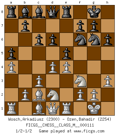 Last move : 1/2-1/2 2023 March 13 8:16:54 [Event "FICGS__CHESS__CLASS_M__000111"] [Site "FICGS"] [Date "2022.10.26"] [Round "1"] [White "Wosch,Arkadiusz"] [Black "Ozen,Bahadir"] [Result "1/2-1/2"] [WhiteElo "2300"] [BlackElo "2254"] 1.e4 e5 2.Nf3 Nc6 3.Bc4 Bc5 4.c3 Nf6 5.d3 d6 6.O-O a5 7.h3 h6 8.Re1 O-O 9.Bb5 Ba7 10.Nbd2 Ne7 11.d4 Ng6 12.a4 c6 13.Bd3 Re8 14.Bc2 Bb8 15.Kh1 Bc7 16.Kg1 Bb8 17.Kh1 Bc7 18.Kg1 Bb8 1/2-1/2 Follow this game move after move (download)One doesn't have to play well, it's enough to play better than your opponent. (Siegbert Tarrasch) Ja, jede Frau in Holland liebt mich bestimmt, und alle Männer hassen mich. (Loek van Wely) Solo existe una cosa que Fischer hace en el Ajedrez sin placer: ¡perder!. (Boris Spassky) La conception d'un plan est le processus par lequel un joueur exploite les avantages de sa position tout en s'efforçant d'en réduire au minimum les inconvénients. Afin de garantir le succès, un plan doit toujours se fonder sur un diagnostic objectif des particularités d'une position. La conception d'un plan est d'autant plus difficile que la position est équilibrée, et grandement facilitée lorsqu'il n'existe qu'un seul plan susceptible de répondre aux exigences de la position. (Harry Golombek) If only faces could talk... (Pat Summerall, Sportscaster during the Super Bowl)