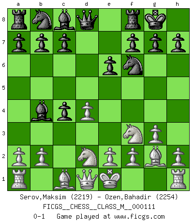 Last move : 0-1 2022 December 14 8:55:17 [Event "FICGS__CHESS__CLASS_M__000111"] [Site "FICGS"] [Date "2022.10.26"] [Round "1"] [White "Serov,Maksim"] [Black "Ozen,Bahadir"] [Result "0-1"] [WhiteElo "2219"] [BlackElo "2254"] 1.d4 Nf6 2.c4 e6 3.g3 Bb4+ 4.Nd2 d5 5.Bg2 O-O 6.Ngf3 dxc4 0-1 This chess game has been lost on time (started : 2022.10.26 18:57:7) Follow this game move after move (download)The stomach is an essential part of the Chess master. (Bent Larsen) Im Wettkampf zwischen starken Meistern kommen Fehler sehr selten vor, deshalb ist es mit bloßem Warten nicht getan. (José Raúl Capablanca) Tu sabes, camarada Pachman, no disfruto el ser un Ministro, preferería jugar al Ajedrez como tu. (Che Guevara) Aux échecs, les retours au sommet sont rares : les dommages psychologiques consécutifs à une défaite sont trop sévères. (Daily Telegraph) Cactus - It is depressed cucumber. (Ilmars Cirulis)