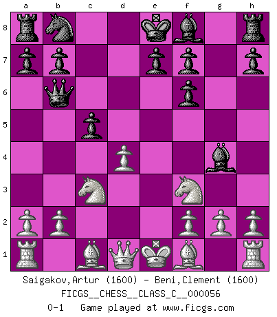 Last move : 0-1 2007 October 25 8:4:49 [Event "FICGS__CHESS__CLASS_C__000056"] [Site "FICGS"] [Date "2007.08.13"] [Round "1"] [White "Saigakov,Artur"] [Black "Beni,Clement"] [Result "0-1"] [WhiteElo "1600"] [BlackElo "1600"] 1.d4 d5 2.c4 c5 3.Nf3 Nf6 4.cxd5 Qxd5 5.Nc3 Qd6 6.e4 Bg4 7.e5 Qb6 8.exf6 gxf6 0-1 This chess game has been lost on time (started : 2007.08.13 4:30:52) QGD : Symmetrical (Austrian) defense Player Black won this chess game. Follow this game move after move (download)If you aren't afraid of Spassky, then I have removed the element of money. (Jim Slater) Wenn Du einsam bist, wenn Du Dich in der Welt wie ein Fremder fühlst, spiele Schach. Das wird Deinen Geist erheben und Dein Ratgeber im Kampf sein. (Aristoteles) La enorme capacidad mental, en la que sin ella no puede un jugador de Ajedrez existir, es demasiado requerida por el Ajedrez al grado de que nunca podrá liberar su mente de este juego. (Albert Einstein) Je fais ceci parce que dans cinquante coups j'obtiendrai cela; je m'appelle Mikhail Moisevitch Botvinnik. (Botvinnik) Whatever you do, don't be bored. This is absolutely the most exciting time we could have possibly hoped to be alive. And things are just starting. (From movie Waking life)