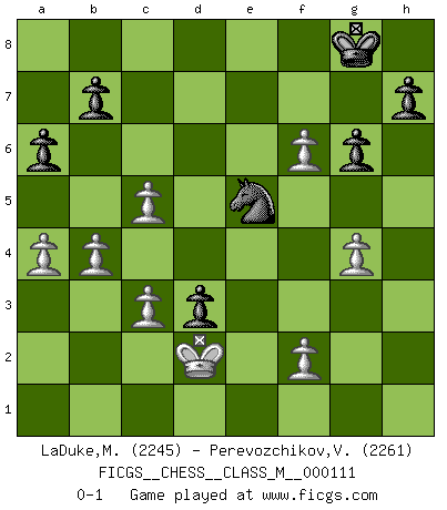 Last move : 0-1 2022 December 26 2:25:29 [Event "FICGS__CHESS__CLASS_M__000111"] [Site "FICGS"] [Date "2022.10.26"] [Round "1"] [White "LaDuke,Matt"] [Black "Perevozchikov,Vjacheslav"] [Result "0-1"] [WhiteElo "2245"] [BlackElo "2261"] 1.e4 e6 2.d4 d5 3.Nc3 Nf6 4.Nf3 dxe4 5.Nxe4 Nxe4 6.Bd3 Nf6 7.Qe2 c5 8.Be3 Qc7 9.O-O-O Be7 10.Kb1 Bd7 11.Rhe1 Nc6 12.dxc5 Nd5 13.Be4 Nxe3 14.Qxe3 Rd8 15.a3 O-O 16.h4 e5 17.g3 Be6 18.Ng5 Bxg5 19.hxg5 Rxd1+ 20.Rxd1 Rd8 21.Rxd8+ Nxd8 22.b4 Bd7 23.Qd3 g6 24.c3 Bc6 25.Bxc6 Nxc6 26.a4 Qd8 27.Qb5 Qd1+ 28.Kb2 Qd7 29.Kc1 e4 30.g4 a6 31.Qe2 Qd3 32.Qxd3 exd3 33.Kd2 f6 34.gxf6 Ne5 0-1 Follow this game move after move (download)Pawn endings are to Chess what putting is to golf. (Cecil Purdy) Sicherlich können nur Meister einen Stil haben. Daß ein nicht-Meister auch nur ein einziges Mal in seinem Leben eine Partie folgerecht durchführte, habe ich niemals bemerkt. (Emanuel Lasker) Repentinamente, me resultaba obvio en mi analisis que yo había pasado por alto lo que Fischer había visto en el tablero con la mas grande facilidad. (Mikhail Botvinnik) Un footballeur joue avec ses pieds, parfois avec sa tête. Un joueur d'échecs ne joue qu'avec sa tête. Et quand il ne joue plus, il meurt. (Jacob Murray) Perhaps the current trend of many chess professionals taking up the more lucrative pastime of poker is not a wholly negative one. It may not be too late for humans to relearn how to take risks in order to innovate and thereby maintain the advanced lifestyles we enjoy. And if it takes a poker-playing supercomputer to remind us that we can't enjoy the rewards without taking the risks, so be it. (The Chess Master and the Computer, by Garry Kasparov - 2010)