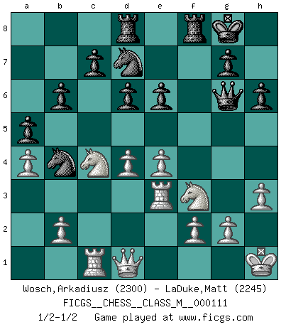 Last move : 1/2-1/2 2023 March 16 22:54:33 [Event "FICGS__CHESS__CLASS_M__000111"] [Site "FICGS"] [Date "2022.10.26"] [Round "1"] [White "Wosch,Arkadiusz"] [Black "LaDuke,Matt"] [Result "1/2-1/2"] [WhiteElo "2300"] [BlackElo "2245"] 1.e4 e5 2.Nf3 Nc6 3.Bc4 Nf6 4.d3 Bc5 5.c3 O-O 6.O-O d6 7.Nbd2 a5 8.Re1 Be6 9.a4 h6 10.Bxe6 fxe6 11.Nc4 b6 12.h3 Qe8 13.Be3 Bxe3 14.Rxe3 Qg6 15.Rc1 Rad8 16.Kh1 Nd7 17.d4 exd4 18.cxd4 Nb4 1/2-1/2 Follow this game move after move (download)The battle for the ultimate truth will never be won. And that's why Chess is so fascinating. (Hans Kmoch) Die jungen Leute sollen verstehen, dass sie noch etwas von mir lernen können und müssen. (Viktor Kortschnoi) El jugador de combinación piensa hacia adelante; comienza de la posición dada y trabaja las movidas contundentes en su mente. (Emanuel Lasker) Dans le domaine de la peinture, de la gravure et de la sculpture, dès la première décennie de notre siècle, les artistes abandonnent la représentation de la partie d'échecs pour se concentrer sur les pièces, sur les échiquiers et sur toutes les variations auxquelles les unes et les autres peuvent donner lieu. On passe en quelque sorte d'un thème social à un thème musical (au sens de la musica médiévale, c'est-à-dire d'une notion qui inclue le rythme, l'harmonie, la construction et la déconstruction, etc.). Graphiquement et picturalement, l'échiquier apparaît comme une structure ouverte, dynamique, d'une richesse infinie, autorisant toutes les combinatoires et débouchant sur des mouvements et des rythmes de nature exponentielle. (Michel Pastoureau) Unless in communicating with it one says exactly what one means, trouble is bound to result. (Alan Turing, about computers)