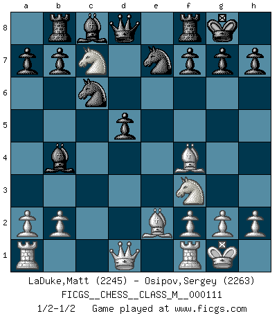 Last move : 1/2-1/2 2022 November 18 8:11:27 [Event "FICGS__CHESS__CLASS_M__000111"] [Site "FICGS"] [Date "2022.10.26"] [Round "1"] [White "LaDuke,Matt"] [Black "Osipov,Sergey"] [Result "1/2-1/2"] [WhiteElo "2245"] [BlackElo "2263"] 1.e4 c5 2.d4 cxd4 3.c3 dxc3 4.Nxc3 Nc6 5.Nf3 e6 6.Be2 Bb4 7.O-O Nge7 8.Nb5 d5 9.Bf4 O-O 10.Nc7 Rb8 11.exd5 exd5 12.Nb5 Ra8 13.Nc7 Rb8 14.Nb5 Ra8 15.Nc7 Rb8 1/2-1/2 Follow this game move after move (download)If you aren't afraid of Spassky, then I have removed the element of money. (Jim Slater) Wie bekannt hörte Morphy 1859 auf, Schach zu spielen. Seine Enttäuschung galt nicht so sehr dem Schach, wie den Schachspielern. (Robert James Fischer) El Ajedrez es tan interesante por sí solo, que no es necesario un interés monetario para persuadir a una persona a que lo practique; por lo tanto, nunca se juega por dinero. (Benjamin Franklin) Les échecs sont plus proches de l'art de l'assassinat que de l'art de la guerre. (Arturo Perez-Reverte) I live to kill Traxler counterattack. (Ilmars Cirulis)