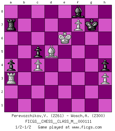 Last move : 1/2-1/2 2023 December 13 14:30:36 [Event "FICGS__CHESS__CLASS_M__000111"] [Site "FICGS"] [Date "2022.10.26"] [Round "1"] [White "Perevozchikov,Vjacheslav"] [Black "Wosch,Arkadiusz"] [Result "1/2-1/2"] [WhiteElo "2261"] [BlackElo "2300"] 1.Nf3 Nf6 2.g3 d5 3.Bg2 c6 4.O-O Bf5 5.d3 h6 6.c4 e6 7.Qb3 Qb6 8.Nc3 Qxb3 9.axb3 Nbd7 10.cxd5 exd5 11.Bd2 a6 12.Nd4 Bh7 13.Na4 Bd6 14.b4 O-O 15.Rfe1 g5 16.Nb3 Rab8 17.Nac5 Nxc5 18.bxc5 Be7 19.Bh3 Ne8 20.Bc3 Bg6 21.e4 Nf6 22.f4 gxf4 23.gxf4 dxe4 24.dxe4 Rfd8 25.f5 Bh5 26.e5 Nd5 27.f6 Bf8 28.Bf5 Nxc3 29.bxc3 Rd5 30.c4 R5d8 31.Kg2 b5 32.cxb6 Rxb6 33.Re3 Bd1 34.Na5 Rd2+ 35.Kg3 Bh5 36.Rd3 Rxd3+ 37.Bxd3 Bb4 38.Kh4 Bf3 39.Kg3 Bh5 40.Rg1 Bxa5 41.Kh4 Kh8 42.Kxh5 Bc3 43.e6 fxe6 44.f7 Bg7 45.Rf1 Bf8 46.Rg1 Bg7 47.Be4 c5 48.Ra1 e5 49.Rf1 Bf8 50.Bd5 Kh7 51.Rf3 Rb2 52.h3 Rb6 53.Rg3 Bg7 54.Rf3 Bf8 55.Rg3 Bg7 56.Rd3 Bf8 57.Rf3 Rd6 58.Rg3 Bg7 59.Rf3 Bf8 60.Kg4 Kg6 61.Rg3 a5 62.Kf3 Kf6 63.Ke4 a4 64.Rf3+ Kg5 65.Kxe5 Ra6 66.Ra3 Bg7+ 67.Ke4 h5 68.Kd3 h4 69.Ke4 Kg6 70.Kf4 Kh6 71.Kg4 Bf8 72.Kf5 Kg7 73.Kg5 Be7+ 74.Kf5 Ra7 75.Ke6 Bf8 76.Kf5 Be7 77.Ke6 Bf8 1/2-1/2 Follow this game move after move (download)When your house is on fire, you can't be bothered with the neighbors. Or, as we say in Chess, if your King is under attack you don't worry about losing a Pawn on the Queen's side. (Gary Kasparov) Fischer ist das größte Genie, das je vom Schachhimmel heruntergestiegen ist. (Mikhail Nekhemyevich Tal) Para mi, el Ajedrez es la vida y cada partida es como una nueva vida. Todo jugador de Ajedrez suele vivir muchas vidas durante su vida. (Eduard Gufeld) Je crois qu'il existe des manières très spécifiques de jouer efficacement contre une machine. Evidemment, nous n'avons aucune chance en technique pure, parce que l'ordinateur calcule de manière parfaite. Mais lorsque nous faisons appel à notre cerveau, en utilisant l'intuition et la compréhension, alors nous restons beaucoup plus forts. (Anatoli Karpov) The production of too many useful things results in too many useless people. (Karl Marx)