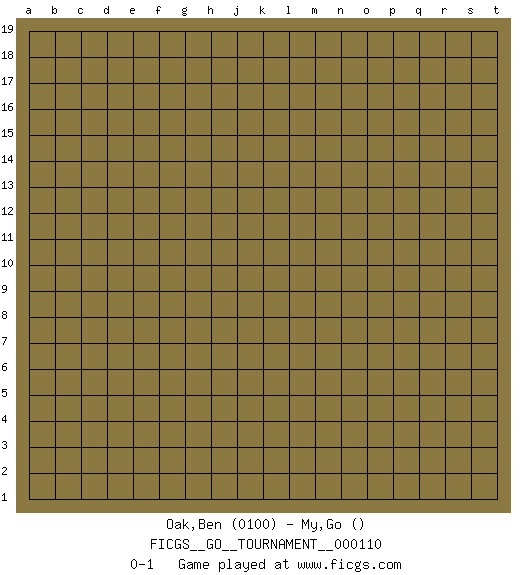 Last move : 0-1 2022 November 28 12:11:58 [Event "FICGS__GO__TOURNAMENT__000110"] [Site "FICGS"] [Date "2022.10.29"] [Round "1"] [Black "Oak,Ben"] [White "My,Go"] [Result "0-1"] [Rating 1 "0100"] 0-1 This go game has been lost on time (started : 2022.10.29 0:54:30) Follow this game move after move (download)The simplest move is the best move. (Anonymous) In God we trust, all others we virus scan. (Anonymous)