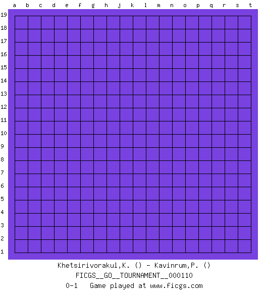 Last move : 0-1 2022 November 28 12:11:58 [Event "FICGS__GO__TOURNAMENT__000110"] [Site "FICGS"] [Date "2022.10.29"] [Round "1"] [Black "Khetsirivorakul,Khet"] [White "Kavinrum,Puttiset"] [Result "0-1"] 0-1 This go game has been lost on time (started : 2022.10.29 0:54:30) Follow this game move after move (download)A meijin needs no joseki. (Anonymous) Rules and bones are meant to be broken. (Anonymous)