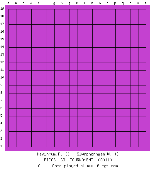Last move : 0-1 2022 November 28 12:11:58 [Event "FICGS__GO__TOURNAMENT__000110"] [Site "FICGS"] [Date "2022.10.29"] [Round "1"] [Black "Kavinrum,Puttiset"] [White "Siwaphonngam,Worayut"] [Result "0-1"] 0-1 This go game has been lost on time (started : 2022.10.29 0:54:30) Follow this game move after move (download)Big groups never die. (Anonymous) Hello Thibault, if I have had a plan (and I had one, I hope), I have forgotten it during the last week... - Hello Heinz-Georg. What do you mean a plan ? (Anonymous players, during a Big Chess game)