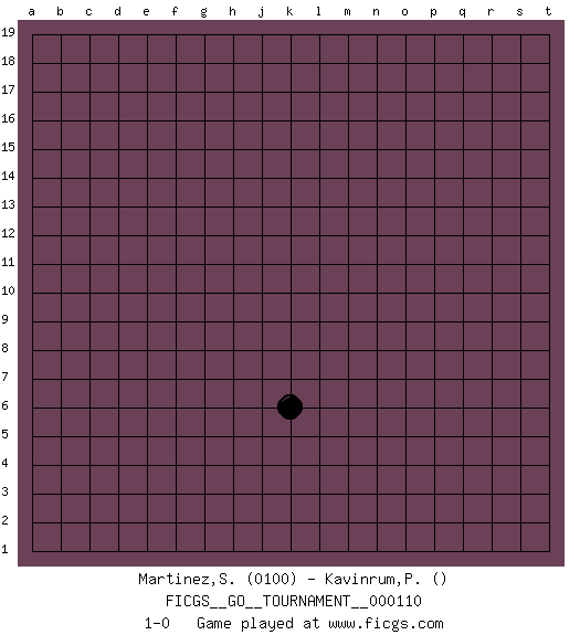 Last move : 1-0 2022 November 29 14:20:0 [Event "FICGS__GO__TOURNAMENT__000110"] [Site "FICGS"] [Date "2022.10.29"] [Round "1"] [Black "Martinez,Silvio"] [White "Kavinrum,Puttiset"] [Result "1-0"] [Rating 1 "0100"] 1.k6 1-0 This go game has been lost on time (started : 2022.10.29 0:54:30) Follow this game move after move (download)Every move brings change. (Pierre Audouard) A clear conscience is usually the sign of a bad memory. (Unknown)
