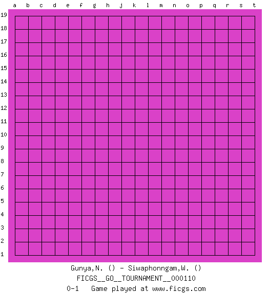Last move : 0-1 2022 November 28 12:11:58 [Event "FICGS__GO__TOURNAMENT__000110"] [Site "FICGS"] [Date "2022.10.29"] [Round "1"] [Black "Gunya,Nattawut"] [White "Siwaphonngam,Worayut"] [Result "0-1"] 0-1 This go game has been lost on time (started : 2022.10.29 0:54:30) Follow this game move after move (download)To emphasize the lack of determination in his moves, one speaks of chance. (Pierre Audouard) May the force be with you. (Han Solo in Star Wars ep.4)