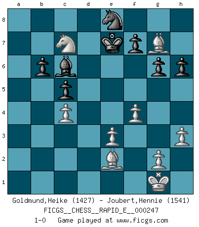 Last move : 1-0 2023 January 30 17:5:9 [Event "FICGS__CHESS__RAPID_E__000247"] [Site "FICGS"] [Date "2022.10.29"] [Round "1"] [White "Goldmund,Heike"] [Black "Joubert,Hennie"] [Result "1-0"] [WhiteElo "1427"] [BlackElo "1541"] 1.b4 Nf6 2.Bb2 g6 3.e3 Bg7 4.c4 O-O 5.Nf3 d6 6.Be2 Nbd7 7.d3 e5 8.O-O c6 9.Nbd2 Qc7 10.Qc2 a5 11.a3 axb4 12.axb4 Rxa1 13.Rxa1 b6 14.h3 Bb7 15.Ng5 h6 16.Ngf3 Ra8 17.Nb3 Rxa1+ 18.Bxa1 Qb8 19.Qa2 Qa8 20.Qxa8+ Bxa8 21.d4 exd4 22.Nbxd4 c5 23.bxc5 dxc5 24.Nb5 Kf8 25.Ne5 Nxe5 26.Nc7 Bc6 27.Bxe5 Ke7 28.f4 Ne8 29.Bxg7 1-0 This chess game has been lost on time (started : 2022.10.29 11:38:33) Follow this game move after move (download)Everything is in a state of flux, and this includes the world of Chess. (Mikhail Botvinnik) Die starken Figuren des Gegners muss man abtauschen. (José Raúl Capablanca) Robert Fischer es la ley hacia si mismo. (Larry Evans) Les pièces de l'échiquier étaient impitoyables. Elles le retenaient, elles l'absorbaient. Il y avait de l'horreur en cela, mais aussi une harmonie unique. Car, qu'y a-t-il dans le monde, à part les échecs ? (V. Nabokov) If everyone is thinking alike, then somebody isn't thinking. (US General George S. Patton)