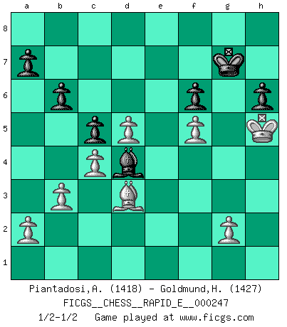 Last move : 1/2-1/2 2023 January 15 13:10:47 [Event "FICGS__CHESS__RAPID_E__000247"] [Site "FICGS"] [Date "2022.10.29"] [Round "1"] [White "Piantadosi,Angelo"] [Black "Goldmund,Heike"] [Result "1/2-1/2"] [WhiteElo "1418"] [BlackElo "1427"] 1.d4 Nf6 2.c4 b6 3.Nc3 Bb7 4.Bg5 e6 5.e3 c5 6.Nf3 Be7 7.Be2 O-O 8.O-O d6 9.Bh4 Nbd7 10.Bg3 Nh5 11.d5 Nxg3 12.hxg3 Nf6 13.e4 exd5 14.exd5 Re8 15.Re1 h6 16.Bd3 Nh7 17.Qc2 Ng5 18.Nxg5 Bxg5 19.Kf1 Qf6 20.Rxe8+ Rxe8 21.Re1 Rxe1+ 22.Kxe1 Qe5+ 23.Qe2 Qxe2+ 24.Kxe2 Kf8 25.Ne4 Be7 26.b3 Bc8 27.f4 Bf5 28.Nxc5 dxc5 29.Bxf5 g6 30.Bc2 Bf6 31.Kf3 Ke7 32.g4 Bd4 33.f5 gxf5 34.gxf5 f6 35.Kg4 Kf7 36.Kh5 Kg7 37.Bd3 1/2-1/2 Follow this game move after move (download)Chess is no whit inferior to the violin, and we have a large number of professional violinists. (Mikhail Botvinnik) Im Reiche der Wirklichkeit ist man nie so glücklich wie im Reiche der Gedanken. (Arthur Schopenhauer) Hoy en día, si tu no eres un Gran Maestro a los 14 años, es mejor que lo olvides. (Anand Viswanathan) La conception d'un plan est le processus par lequel un joueur exploite les avantages de sa position tout en s'efforçant d'en réduire au minimum les inconvénients. Afin de garantir le succès, un plan doit toujours se fonder sur un diagnostic objectif des particularités d'une position. La conception d'un plan est d'autant plus difficile que la position est équilibrée, et grandement facilitée lorsqu'il n'existe qu'un seul plan susceptible de répondre aux exigences de la position. (Harry Golombek) There are two major products that came out of Berkeley: LSD and UNIX. We do not believe this is to be a coincidence. (Jeremy S. Anderson)