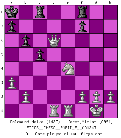 Last move : 1-0 2023 February 12 15:55:20 [Event "FICGS__CHESS__RAPID_E__000247"] [Site "FICGS"] [Date "2022.10.29"] [Round "1"] [White "Goldmund,Heike"] [Black "Jerez,Miriam"] [Result "1-0"] [WhiteElo "1427"] [BlackElo "0991"] 1.d4 Nf6 2.c4 d5 3.e3 Nc6 4.Bd3 e5 5.cxd5 Nxd5 6.Nc3 Bb4 7.Qc2 O-O 8.Bd2 Re8 9.Nf3 Qf6 10.Nxd5 Qd6 11.Nc3 b6 12.O-O exd4 13.Nxd4 Nxd4 14.exd4 Qxd4 15.a3 Bd6 16.Be3 Qf6 17.Bxh7+ Kh8 18.Bd3 Bb7 19.Qe2 Kg8 20.Rfe1 c5 21.Qh5 Rac8 22.Qh7+ Kf8 23.Qh8+ Ke7 24.Bg5 Kd7 25.Qh3+ Kc6 26.Bxf6 gxf6 27.Qf3+ Kc7 28.Qxf6 Rf8 29.Rad1 Kb8 30.Qxd6+ Ka8 31.Be4 Bxe4 32.Nxe4 1-0 This chess game has been lost on time (started : 2022.10.29 11:38:33) Follow this game move after move (download)When I have White, I win because I am white; When I have Black, I win because I am Bogolyubov. (Bogolyubov) Schach sollte überall auf der Welt Schulfach werden. Es fördert die geistige Auseinandersetzung. Es lehrt die Demut in der Niederlage. (Garry Kasparov) No puedes jugar al Ajedrez si eres de corazón noble. (Proverbio Francés) Les Echecs sont affaire de jugement sensible. Savoir quand frapper et quand esquiver. (Fischer) If things go wrong, don't go with them. (Roger Babson)