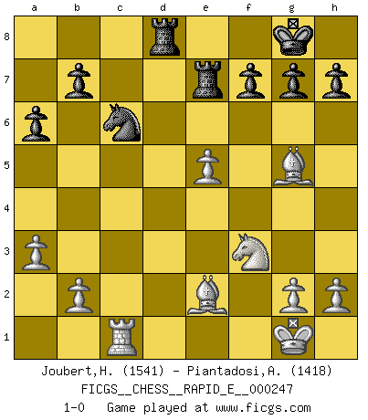 Last move : 1-0 2022 December 22 22:7:2 [Event "FICGS__CHESS__RAPID_E__000247"] [Site "FICGS"] [Date "2022.10.29"] [Round "1"] [White "Joubert,Hennie"] [Black "Piantadosi,Angelo"] [Result "1-0"] [WhiteElo "1541"] [BlackElo "1418"] 1.e4 Nf6 2.e5 Nd5 3.d4 d6 4.c4 Nb6 5.f4 dxe5 6.fxe5 e6 7.Be3 Be7 8.Nc3 O-O 9.Nf3 Nc6 10.Be2 Bd7 11.O-O a6 12.Rc1 Nb8 13.Qd2 Na4 14.a3 Nxc3 15.Rxc3 Nc6 16.d5 exd5 17.cxd5 Nb8 18.Rfc1 Re8 19.Rxc7 Bc6 20.Rxe7 Rxe7 21.dxc6 Nxc6 22.Qxd8+ Rxd8 23.Bg5 1-0 Follow this game move after move (download)When you don't know what to play, wait for an idea to come into your opponent's mind. You may be sure that idea will be wrong. (Siegbert Tarrasch) Ich kämpfe solange mein Gegner einen Fehler machen kann. (Emanuel Lasker) El juego del Ajedrez no es solamente una diversión quieta; algunas cualidades muy valuables de la mente se pueden adquirir y cultivar con el, como convertirlos en habitos disponibles para toda ocasión; ya que la vida es algo así como el Ajedrez. (Benjamin Franklin) Il n'y a pas de prix trop élevé au scalp de l'ennemi. (Koblentz) Art is the triumph over chaos. (John Cheever)