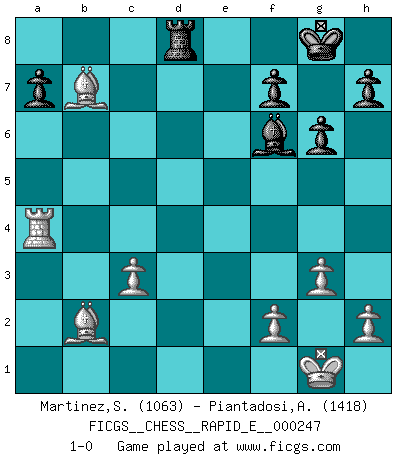 Last move : 1-0 2022 November 27 1:53:6 [Event "FICGS__CHESS__RAPID_E__000247"] [Site "FICGS"] [Date "2022.10.29"] [Round "1"] [White "Martinez,Silvio"] [Black "Piantadosi,Angelo"] [Result "1-0"] [WhiteElo "1063"] [BlackElo "1418"] 1.e4 c5 2.c4 d6 3.Nf3 Nc6 4.Nc3 e6 5.g3 Nf6 6.Bg2 d5 7.exd5 exd5 8.cxd5 Nxd5 9.O-O Be7 10.d4 O-O 11.Re1 cxd4 12.Nxd4 Nxd4 13.Qxd4 Nxc3 14.bxc3 Bf6 15.Qxd8 Rxd8 16.Bb2 Rb8 17.Rad1 Be6 18.a4 Bb3 19.Rxd8+ Rxd8 20.Bxb7 Bxa4 21.Re4 g6 22.Rxa4 1-0 Follow this game move after move (download)If your opponent offers you a draw, try to work out why he thinks he's worse off. (Nigel Short) Als er Schachweltmeister wurde ließ er praktisch alle stärksten Sovietspieler für sich arbeiten. Wenn ein auch nur mittelmässiger Meister ein Spezialist für eine bestimmte Eröffnung war, wurde er von Karpov gerufen. Das wurde alles geheim gehalten. (Mikhail Moiseyevich Botvinik) Me siento como si fuera una pieza en una partida de Ajedrez, cuando mi oponente me indica: esa pieza no puede ser movida. (Soren Kierkegaard) A chaque perte on perd un peu de soi. (Joël Lautier) Computers make it easier to do a lot of things, but most of the things they make it easier to do don't need to be done. (Andy Rooney)
