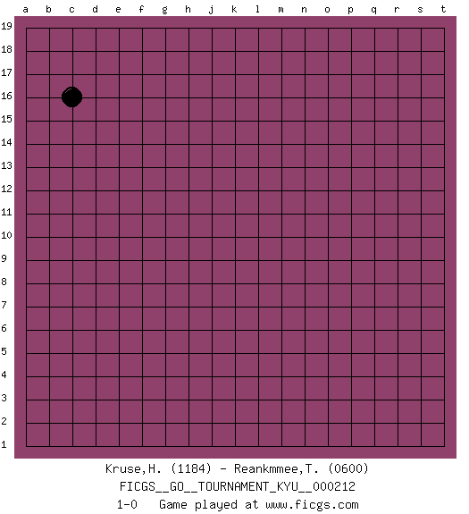 Last move : 1-0 2022 November 29 2:16:7 [Event "FICGS__GO__TOURNAMENT_KYU__000212"] [Site "FICGS"] [Date "2022.10.29"] [Round "1"] [Black "Kruse,Herbert"] [White "Reankmmee,Thitipol"] [Result "1-0"] [Rating 1 "1184"] [Rating 2 "0600"] 1.c16 1-0 This go game has been lost on time (started : 2022.10.29 19:11:21) Follow this game move after move (download)On the third line, four die, six live. (Anonymous) Optimism is a variety of information deficit. Sometimes especially true for correspondence chess games. (Michael Aigner)