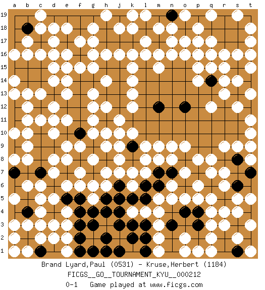 Last move : 0-1 2022 November 11 8:41:18 [Event "FICGS__GO__TOURNAMENT_KYU__000212"] [Site "FICGS"] [Date "2022.10.29"] [Round "1"] [Black "Brand Lyard,Paul"] [White "Kruse,Herbert"] [Result "0-1"] [Rating 1 "0531"] [Rating 2 "1184"] 1.e5 c4 2.l12 q4 3.r4 r3 4.r2 q3 5.s3 s4 6.r5 s2 7.c10 d17 8.f12 q17 9.q5 p5 10.p4 p6 11.o6 o5 12.p3 q2 13.t4 t3 14.p2 l4 15.b14 j3 16.o4 n5 17.q6 q8 18.n3 m2 19.b7 c6 20.t2 t5 21.r17 r16 22.e17 e16 23.f16 d16 24.f18 f15 25.e15 e14 26.k9 g16 27.s17 q16 28.l15 f17 29.f8 c11 30.n12 d11 31.f5 d10 32.p10 d8 33.r18 h9 34.q13 d3 35.s13 o17 36.h13 h7 37.s10 s16 38.k17 g10 39.n15 j7 40.n7 m16 41.o14 l17 42.b18 b16 43.m10 k16 44.f2 g3 45.h18 k18 46.a12 b17 47.j14 p8 48.d13 g12 49.s8 r7 50.p12 n8 51.l13 o9 52.j1 j2 53.h11 g11 54.s15 t16 55.b2 c5 56.m19 m18 57.d19 c3 58.a9 b8 59.j12 h12 60.l6 l8 61.j19 d18 62.c14 d14 63.k11 j10 64.m14 j11 65.h15 h16 66.p19 d5 67.h5 q7 68.q11 s14 69.n13 r13 70.d4 k15 71.j15 k14 72.p14 k13 73.r11 s5 74.e7 m9 75.c1 c2 76.g7 e8 77.e10 j9 78.m7 f9 79.g14 g13 80.j5 h4 81.m11 l7 82.g19 g18 83.a19 e13 84.q15 n16 85.n19 d7 86.t12 c18 87.r19 k19 88.c12 b13 89.b15 b9 90.n11 r6 91.a4 p17 92.d1 o16 93.o12 b6 94.o18 l19 95.g6 o7 96.t9 r9 97.l1 t17 98.j6 j16 99.n4 b10 100.e12 e18 101.f3 e3 102.c15 k6 103.g1 h3 104.r12 e2 105.n1 k1 106.m12 e6 107.s18 g15 108.m6 a18 109.o13 p1 110.o11 a2 111.c9 c19 112.j4 n18 113.h8 b12 114.n10 k12 115.l3 g2 116.q9 m8 117.k3 m1 118.q14 e1 119.s11 k7 120.t7 g8 121.n2 d2 122.r5 q5 123.q10 p16 124.a15 f6 125.l10 g5 126.f4 d15 127.h2 b1 128.c1 o19 129.b4 a1 130.f11 p18 131.l5 n6 132.a11 e4 133.o15 j8 134.f1 m3 135.k2 m5 136.s6 o1 137.l11 f7 138.h1 s9 139.l2 t13 140.q18 t10 141.n14 t15 142.o3 q19 143.h17 c13 144.c7 r4 145.s1 h10 146.m17 n17 147.o10 a3 148.b5 a5 149.r1 a14 150.a7 r14 151.d9 e15 152.k5 t1 153.g4 m4 154.g3 o2 155.j3 b3 156.f13 q1 157.a17 s12 158.p4 t11 159.b4 t8 160.s1 t9 161.f14 b11 162.t19 k10 163.h4 l9 164.f10 l16 165.c8 e9 166.p9 n9 167.f19 r15 168.o4 t18 169.j13 s19 170.p13 h6 171.a6 g5 172.j17 g6 173.n19 h14 174.l14 a8 175.c7 d12 176.n3 e11 177.p3 g17 178.b19 k4 179.f10 p15 180.a7 m15 181.a18 a16 182.b18 a10 183.m13 c16 184.r10 j18 185.e19 h19 186.p11 q12 187.m12 a13 188.q14 p14 189.o12 q15 0-1 Follow this game move after move (download)In an unreasonable situation, an unreasonable move is reasonable. (Tamino) All the biggest technological inventions created by man - the airplane, the automobile, the computer - says little about his intelligence, but speaks volumes about his laziness. (Mark Kennedy)