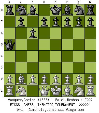 Last move : 0-1 2006 August 26 6:44:2 [Event "FICGS__CHESS__THEMATIC_TOURNAMENT__000004"] [Site "FICGS"] [Date "2006.06.28"] [Round "1"] [White "Vasquez,Carlos"] [Black "Patel,Reshma"] [Result "0-1"] [WhiteElo "1525"] [BlackElo "1700"] 1.b4 c6 2.Bb2 a5 3.bxa5 Qxa5 0-1 This chess game has been lost on time (started : 2006.06.28 11:29:44) Polish : Outflank variation Player Black won this chess game. Follow this game move after move (download)The game of chess is the touchstone of the intellect. (Goethe) Ich erzeugte keinen Neid, da mich die Schachspieler als Musiker und die Musiker als Schachspieler betrachteten. (Mark Taimanov) Realmente no sabemos como el juego fue inventado, aunque hay sospechas. Tan pronto como descubramos a los culpables, se los haremos saber. (Bruce Pandolfini) Avec des compensations pour le matériel en plus... (Anonyme) Over-the-board chess is the favorite of mortals, correspondence chess is the favorite of the gods. (Eduard Dyckhoff)