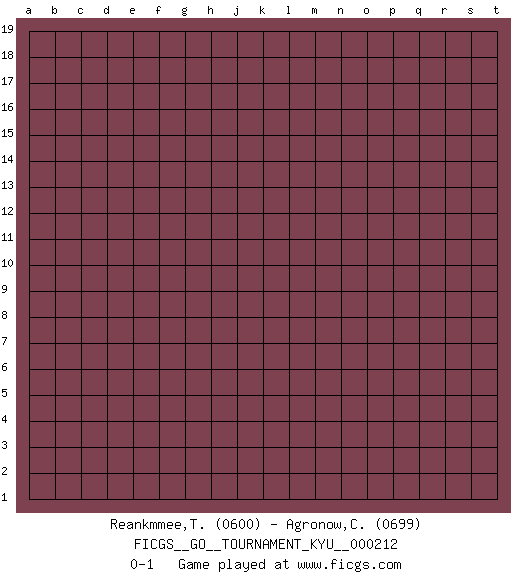 Last move : 0-1 2022 November 29 2:16:7 [Event "FICGS__GO__TOURNAMENT_KYU__000212"] [Site "FICGS"] [Date "2022.10.29"] [Round "1"] [Black "Reankmmee,Thitipol"] [White "Agronow,Cosmo"] [Result "0-1"] [Rating 1 "0600"] [Rating 2 "0699"] 0-1 This go game has been lost on time (started : 2022.10.29 19:11:21) Follow this game move after move (download)It is difficult to know exactly what you are doing. (Pierre Audouard) The worth of a book is to be measured by what you can carry away from it. (James Bryce)
