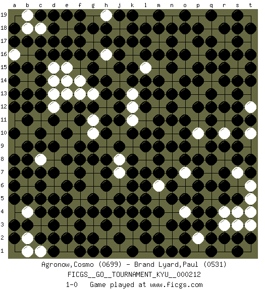 Last move : 1-0 2023 July 29 7:47:19 [Event "FICGS__GO__TOURNAMENT_KYU__000212"] [Site "FICGS"] [Date "2022.10.29"] [Round "1"] [Black "Agronow,Cosmo"] [White "Brand Lyard,Paul"] [Result "1-0"] [Rating 1 "0699"] [Rating 2 "0531"] 1.d4 q14 2.d16 o6 3.n16 e9 4.d9 k12 5.k6 j6 6.j4 p9 7.k5 r3 8.h14 r8 9.h10 q12 10.n12 n3 11.k7 n10 12.l10 f2 13.f4 g7 14.f8 e7 15.f9 r11 16.e8 q6 17.q16 p16 18.p15 f13 19.h13 h12 20.j12 k9 21.l9 l8 22.k8 j8 23.j9 h9 24.k10 m12 25.g12 e11 26.e10 n5 27.h11 l15 28.l16 n8 29.r16 r17 30.q17 q18 31.p17 o17 32.o16 o15 33.n15 m6 34.m7 m5 35.m8 n7 36.l7 h5 37.h4 f5 38.d7 p11 39.o14 m13 40.k15 d12 41.n13 p13 42.g4 g17 43.g16 p5 44.m11 c19 45.l14 b16 46.c14 e15 47.f12 d6 48.e6 s7 49.m14 l17 50.m16 r10 51.l12 k2 52.l3 s6 53.l13 r5 54.n17 q7 55.o18 p3 56.s16 q1 57.t16 k16 58.k17 o4 59.n9 o7 60.o9 o2 61.l2 s15 62.r14 l4 63.k4 g6 64.f7 b6 65.c6 j7 66.h8 j3 67.e5 n2 68.m1 c11 69.c9 h16 70.g15 e3 71.e4 p10 72.j16 c8 73.b8 k11 74.h7 e14 75.b11 n4 76.l5 g3 77.g8 p7 78.o8 t17 79.s17 o10 80.p8 c4 81.d5 o12 82.n11 g11 83.f11 j14 84.j15 r9 85.m9 d3 86.h3 b14 87.c13 h2 88.k3 g19 89.k18 q4 90.r15 e17 91.e16 b13 92.b12 r13 93.s14 b18 94.c7 t12 95.r18 b2 96.k19 t4 97.s13 b10 98.c12 e18 99.f16 j18 100.h17 t2 101.s12 n19 102.j17 t10 103.s11 f19 104.h18 l19 105.l18 e1 106.f3 t19 107.t18 t9 108.t11 j1 109.j2 h1 110.k1 p19 111.o19 c18 112.c16 o1 113.n1 d14 114.c15 t7 115.s10 d2 116.g2 b5 117.g1 s2 118.h6 t15 119.t14 s1 120.s9 d1 121.f1 q3 122.m4 c17 123.g18 r19 124.s19 d13 125.e12 j1 126.h1 b4 127.q8 d19 128.f18 b1 129.b7 a9 130.b9 c3 131.e2 f14 132.d11 m17 133.m18 a19 134.b15 a4 135.c10 h19 136.j19 a7 137.a8 s4 138.t8 t1 139.a6 a17 140.a10 a12 141.a14 m17 142.f17 q10 143.s8 p2 144.o11 k13 145.k14 b3 146.a7 t6 147.r12 r2 148.o13 g10 149.g9 a16 150.a15 t5 151.p12 c2 152.c5 t3 153.q13 t10 154.p14 a2 155.a5 c1 156.f2 a11 157.a13 d18 158.e19 m3 159.l4 h19 160.f19 r7 161.q11 b19 162.d17 b17 163.a18 c18 164.d18 e18 165.j13 q5 166.q9 a16 167.b17 p6 168.j11 b19 169.q12 b18 170.a17 p1 171.j5 j8 172.g5 o5 173.d19 s5 174.m10 a1 175.a3 c3 176.c2 e13 177.c17 b2 178.b3 c1 179.d2 j7 180.c19 e3 181.c4 e1 182.d3 g13 183.g14 a11 184.a2 d15 185.b13 b4 186.b5 r6 187.s18 r1 188.n18 p4 189.p18 b1 190.d1 o3 191.m13 q2 192.t15 r4 193.q19 s3 194.m2 n6 195.m19 pass 196.a12 pass 197.q15 pass 198.l17 pass 199.l6 o7 200.p6 q5 201.p5 s7 202.r6 m6 203.n6 m5 204.n5 m3 205.n3 r4 206.q3 p2 207.q2 n2 208.o2 s4 209.r5 o4 210.p4 s3 211.s2 n10 212.o10 t6 213.r7 p1 214.q1 r1 215.s1 t3 216.s5 q7 217.p7 m6 218.q4 r10 219.q6 r3 220.r2 t5 221.t2 p3 222.o3 n4 223.o5 t4 224.t7 p10 225.q10 o4 226.o1 p2 227.p3 r8 228.r9 pass 229.e17 n8 230.n7 pass 231.f6 1-0 Follow this game move after move (download)If you have lost four corners, resign. (Anonymous) Control your own destiny or someone else will. (Jack Welch)