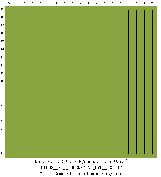 Last move : 0-1 2022 November 29 2:16:7 [Event "FICGS__GO__TOURNAMENT_KYU__000212"] [Site "FICGS"] [Date "2022.10.29"] [Round "1"] [Black "Dao,Paul"] [White "Agronow,Cosmo"] [Result "0-1"] [Rating 1 "1298"] [Rating 2 "0699"] 0-1 This go game has been lost on time (started : 2022.10.29 19:11:21) Follow this game move after move (download)... {it is} something unearthly... if there are sentient beings on other planets, then they play go. (Emanuel Lasker, chess world champion) A good programmer is someone who always looks both ways before crossing a one-way street. (Doug Linder)