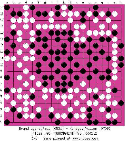 Last move : 1-0 2023 April 13 14:17:31 [Event "FICGS__GO__TOURNAMENT_KYU__000212"] [Site "FICGS"] [Date "2022.10.29"] [Round "1"] [Black "Brand Lyard,Paul"] [White "Kehayov,Yulian"] [Result "1-0"] [Rating 1 "0531"] [Rating 2 "0709"] 1.g11 d4 2.m10 q16 3.g7 d16 4.m5 j16 5.n15 d11 6.p11 p4 7.k13 k4 8.e13 d13 9.f18 d18 10.o8 q5 11.k8 p17 12.m13 l17 13.r11 q15 14.d8 c5 15.r8 e12 16.f12 e11 17.h10 e14 18.f14 e15 19.f15 f16 20.j11 m4 21.f9 g5 22.g13 n5 23.r16 r15 24.s15 s14 25.r14 s16 26.j18 h17 27.q14 r17 28.j14 n16 29.r3 r4 30.o2 q3 31.o3 o4 32.p5 p6 33.o12 m16 34.m3 l3 35.l14 k18 36.m8 c10 37.j6 j5 38.o10 m6 39.l11 c8 40.o14 p15 41.h12 d7 42.j9 m2 43.l2 k2 44.n18 m18 45.g14 g16 46.e3 d3 47.e5 d5 48.m12 e4 49.g8 d9 50.k15 e6 51.p13 s13 52.h15 h16 53.j12 f3 54.l15 k16 55.d12 c12 56.b15 b16 57.q8 r6 58.d15 c15 59.j7 r7 60.a12 b11 61.t11 s8 62.b13 a11 63.h2 h3 64.k6 k5 65.k12 s12 66.r9 s9 67.e7 c6 68.p18 q18 69.k10 h6 70.f10 e8 71.n13 o15 72.p9 m15 73.d14 c14 74.l9 f7 75.h8 g6 76.j15 s11 77.s6 r5 78.k7 l5 79.b3 b4 80.n6 o6 81.n9 n7 82.p1 n2 83.t10 s10 84.q12 m14 85.f2 e2 86.a6 a5 87.b18 b17 88.a8 b6 89.e19 d17 90.g18 h18 91.e16 e17 92.j19 k19 93.r1 r2 94.c2 d2 95.c18 c17 96.o1 n3 97.n17 n14 98.r18 s18 99.t13 o18 100.a1 c3 101.t4 s4 102.j1 j2 103.a19 d19 104.l7 l6 105.l19 l18 106.p19 a3 107.s1 s2 108.a14 1-0 Follow this game move after move (download)Fighting must not be the key to go, it should be reserved as your last resource. (Zhong-Pu Liu, about Weiqi) Always remember that you are unique; just like everyone else. (Unknown)