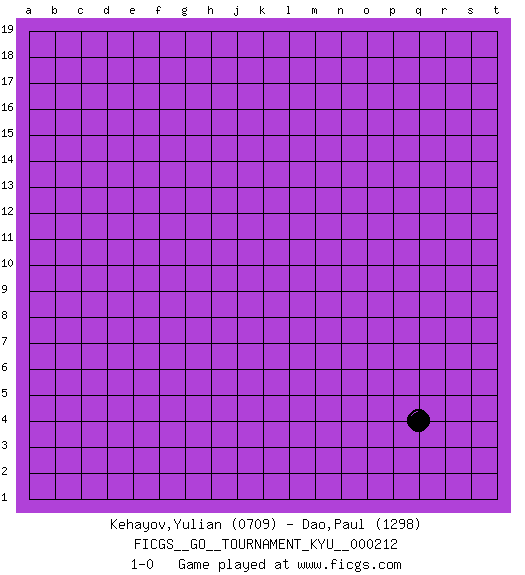 Last move : 1-0 2022 December 7 19:31:45 [Event "FICGS__GO__TOURNAMENT_KYU__000212"] [Site "FICGS"] [Date "2022.10.29"] [Round "1"] [Black "Kehayov,Yulian"] [White "Dao,Paul"] [Result "1-0"] [Rating 1 "0709"] [Rating 2 "1298"] 1.q4 1-0 This go game has been lost on time (started : 2022.10.29 19:11:21) Follow this game move after move (download)Don't get surrounded ! Ever ! (Anonymous) Memory is a crazy woman that hoards colored rags and throws away food. (Austin O'Malley)