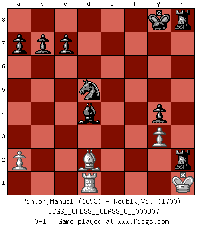 Last move : 0-1 2022 November 22 7:17:2 [Event "FICGS__CHESS__CLASS_C__000307"] [Site "FICGS"] [Date "2022.10.31"] [Round "1"] [White "Pintor,Manuel"] [Black "Roubik,Vit"] [Result "0-1"] [WhiteElo "1693"] [BlackElo "1700"] 1.e4 e5 2.f4 exf4 3.Nf3 d6 4.Bc4 h6 5.O-O g5 6.d4 Bg7 7.c3 Nf6 8.e5 dxe5 9.Bxf7+ Kxf7 10.Nxe5+ Kg8 11.Qb3+ Qd5 12.Qc2 Nc6 13.Ng6 Bf5 14.Nxf4 Bxc2 15.Nxd5 Nxd5 16.Nd2 Re8 17.Nf3 g4 18.Nh4 Nxd4 19.cxd4 Bxd4+ 20.Kh1 Bf6 21.Nf5 Bxf5 22.Bxh6 Bxb2 23.Rxf5 Bxa1 24.Bd2 Re5 25.Rf1 Bd4 26.g3 Re2 27.Rd1 Rexh2+ 0-1 Follow this game move after move (download)In the perfect Chess combination as in a first-rate short story, the whole plot and counter-plot should lead up to a striking finale, the interest not being allayed until the very last moment. (Yates and Winter) Frage: Wie viele Autos haben Sie schon zerstört? - Antwort: Nur zwei. (Loek van Wely) Personalmente, yo prefiero mirar hacia el futuro en donde un programa de computadora gane el título mundial de Ajedrez. La humanidad necesita una lección de humildad. (Richard Dawkings) Les Echecs sont et restent toujours un combat, un combat intégral comme la boxe, la lutte ou un autre sport, et où il doit y avoir un vainqueur et un vaincu. (Joseph Emil Diemer) A good teacher is like a candle - it consumes itself to light the way for others. (Author unknown)