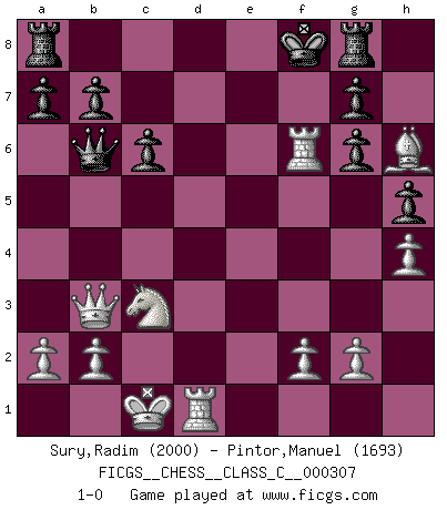 Last move : 1-0 2022 November 7 1:51:9 [Event "FICGS__CHESS__CLASS_C__000307"] [Site "FICGS"] [Date "2022.10.31"] [Round "1"] [White "Sury,Radim"] [Black "Pintor,Manuel"] [Result "1-0"] [WhiteElo "2000"] [BlackElo "1693"] 1.d4 d5 2.c4 c6 3.Nf3 Bf5 4.cxd5 Qxd5 5.Nc3 Qa5 6.Bd2 e6 7.Ne5 Bb4 8.e4 Bg6 9.h4 h5 10.Nxg6 fxg6 11.Qb3 Kf7 12.Bc4 Qb6 13.Bxe6+ Kf8 14.Bxg8 Rxg8 15.Rh3 Nd7 16.Rf3+ Nf6 17.e5 Qxd4 18.O-O-O Be7 19.exf6 Bxf6 20.Bh6 Qb6 21.Rxf6+ 1-0 Follow this game move after move (download)There are two classes of men; those who are content to yield to circumstances and who play whist; those who aim to control circumstances, and who play Chess. (Mortimer Collins) Je älter ich werde, um so mehr schätze ich die Bauern. (Paul Keres) Botvinnik trataba de restarle el misterio al Ajedrez, siempre relacionandolo a situaciones de la vida ordinaria. El gustaba de llamar al Ajedrez un típico problema inexacto similar a aquellos de los cuales la gente siempre tiene que enfrentarse en la vida cotidiana. (Garry Kasparov) Ce qui caractérise les parties de combat, c'est que si le défenseur a constamment de difficiles problèmes à résoudre, l'attaquant doit chercher sans relâche de nouvelles possibilités d'attaque. (Koblentz) True nature is revealed in times of difficulty. (Chinese proverb)