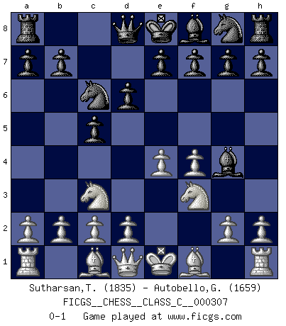 Last move : 0-1 2022 December 28 0:26:8 [Event "FICGS__CHESS__CLASS_C__000307"] [Site "FICGS"] [Date "2022.10.31"] [Round "1"] [White "Sutharsan,Thirunathan"] [Black "Autobello,Giovanni"] [Result "0-1"] [WhiteElo "1835"] [BlackElo "1659"] 1.e4 c5 2.Nc3 Nc6 3.f4 d6 4.Nf3 Bg4 0-1 This chess game has been lost on time (started : 2022.10.31 18:46:56) Follow this game move after move (download)Fischer was a master of clarity and a king of artful positioning. His opponents would see where he was going but were powerless to stop him. (Bruce Pandolfini) Es gibt Leute, die glauben, alles wäre vernünftig, was man mit einem ernsthaften Gesicht tut. (Georg Christoph Lichtenberg) El sobresalir en el Ajedrez es un signo de una mente intrigante. (Sir Arthur Conan Doyle) Toutes choses étant égales, c'est la conviction qui gagne. Alliée à une volonté de vaincre, elle sert de détonateur, suscite des idées, disperse les doutes et aide à penser clairement. (Robert Fischer) The Internet is the world's largest library. It's just that all the books are on the floor. (John Allen Paulos)
