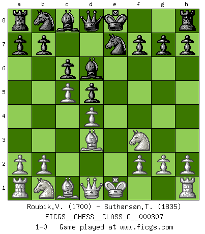 Last move : 1-0 2022 December 22 19:1:24 [Event "FICGS__CHESS__CLASS_C__000307"] [Site "FICGS"] [Date "2022.10.31"] [Round "1"] [White "Roubik,Vit"] [Black "Sutharsan,Thirunathan"] [Result "1-0"] [WhiteElo "1700"] [BlackElo "1835"] 1.e4 e6 2.d4 d5 3.exd5 exd5 4.Nf3 Bd6 5.c4 c6 6.Bd3 Ne7 7.c5 1-0 This chess game has been lost on time (started : 2022.10.31 18:46:56) Follow this game move after move (download)When you absolutely don't know what to do anymore, it is time to panic. (John van der Wiel) Versuche, dich von der Sklaverei der Eröffnungsvarianten zu befreien. Stattdessen soll man gewisse Typenpositionen erlernen, die man eingehend analysiert. (Aaron Nimzowitsch) Todos los jugadores de Ajedrez deberían tener un pasatiempo. (Savielly Tartakower) Je ne crois pas en la psychologie, je crois aux bons coups. (Robert Fischer) Two beer, or not two beer. (Unknown)
