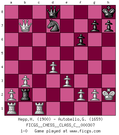 Last move : 1-0 2023 May 13 19:7:20 [Event "FICGS__CHESS__CLASS_C__000307"] [Site "FICGS"] [Date "2022.10.31"] [Round "1"] [White "Hepp,Henrique"] [Black "Autobello,Giovanni"] [Result "1-0"] [WhiteElo "1900"] [BlackElo "1659"] 1.c4 Nf6 2.Nc3 e6 3.Nf3 d5 4.e3 Be7 5.b3 O-O 6.Bb2 c6 7.Qc2 Nbd7 8.Be2 e5 9.O-O Re8 10.cxd5 cxd5 11.Nb5 Bc5 12.Nxe5 a6 13.Nxd7 Nxd7 14.Qc3 f6 15.d4 Bb6 16.Nd6 Re6 17.Nxc8 Rxc8 18.Qd3 Rec6 19.Bf3 Rc2 20.Bxd5+ Kh8 21.Bxb7 Rxb2 22.Bxc8 Qxc8 23.Rfc1 Qd8 24.Qxa6 Bc7 25.Qb7 Bxh2+ 26.Kxh2 1-0 Follow this game move after move (download)When you are lonely, when you feel yourself an alien in the world, play Chess. This will raise your spirits and be your counselor in war. (Aristotle) Alles was am Schachbrett zählt sind gute Züge. (Robert James Fischer) Tu no necesitas jugar muy bien, únicamente ayudar a tu oponenet a que juegue muy mal. (Genrikh Chepukaitis) Plusieurs personnes se sont demandées comment Tal faisait pour gagner... En fait, c'est très simple ! Il met ses pièces au centre de l'échiquier et les sacrifie quelque part ! (David Bronstein) See no evil, hear no evil, speak no evil. (The 3 monkeys)