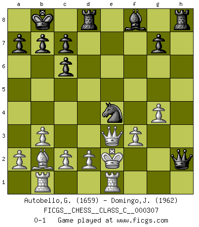 Last move : 0-1 2023 March 22 20:30:18 [Event "FICGS__CHESS__CLASS_C__000307"] [Site "FICGS"] [Date "2022.10.31"] [Round "1"] [White "Autobello,Giovanni"] [Black "Domingo,Jordi"] [Result "0-1"] [WhiteElo "1659"] [BlackElo "1962"] 1.e4 e5 2.Nf3 f5 3.exf5 e4 4.Qe2 Qe7 5.Nd4 Nc6 6.Nxc6 dxc6 7.g3 Bxf5 8.Bg2 O-O-O 9.Nc3 Nf6 10.O-O Kb8 11.b3 h5 12.Bb2 h4 13.Rfe1 hxg3 14.hxg3 Bg4 15.Qe3 Qe5 16.Rab1 Qh5 17.Nxe4 Qh2+ 18.Kf1 Bh3 19.Bxh3 Qxh3+ 20.Ke2 Qh5+ 21.f3 Nxe4 22.g4 Qh2+ 0-1 Follow this game move after move (download)There must have been a time when men were demigods, or they could not have invented Chess. (Gustav Schenk) Wer der Ansicht ist, daß alle Schachspieler verrückt sind, wird durch Studium des Lebens von Emil Josef Diemer nicht auf andere Gedanken kommen. (Hans Ree) El Ajedrez es parte de una cultura y si una cultura esta en decadencia, entonces también el Ajedrez declinará. (Mikhail Botvinnik) Echiquier : carré parfait, comme la Jérusalem nouvelle décrite par l'auteur de l'Apocalypse, huit cases sur huit, exaltation du chiffre 4, symbole du cosmos aux quatre horizons... où le noir et le blanc, l'ombre et la lumière, le mal et le bien s'entremêlent et se conjuguent. (Robert Couffignal, Le Gambit du poète) Drag your thoughts away from your troubles... by the ears, by the heels, or any other way you can manage it. (Mark Twain)