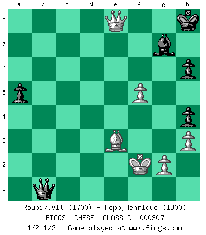 Last move : 1/2-1/2 2023 May 5 19:55:27 [Event "FICGS__CHESS__CLASS_C__000307"] [Site "FICGS"] [Date "2022.10.31"] [Round "1"] [White "Roubik,Vit"] [Black "Hepp,Henrique"] [Result "1/2-1/2"] [WhiteElo "1700"] [BlackElo "1900"] 1.e4 c5 2.Nf3 e6 3.c4 Nc6 4.Be2 Nf6 5.Nc3 Qb6 6.O-O d6 7.a3 Be7 8.d3 O-O 9.Rb1 a6 10.h3 Nd7 11.Be3 Nde5 12.b4 Qc7 13.Qd2 b6 14.Nh2 Nd4 15.f4 Nec6 16.Bd1 Bb7 17.Ne2 b5 18.Nxd4 Nxd4 19.Rc1 Nc6 20.Ng4 Kh8 21.Bf3 Qd7 22.f5 exf5 23.exf5 f6 24.Bd5 Nd8 25.Bxb7 Nxb7 26.Bf2 d5 27.cxb5 Qxb5 28.a4 Qxa4 29.bxc5 d4 30.c6 Nc5 31.Rc4 Qxc6 32.Qc2 Qb5 33.Rb1 Qa5 34.Bxd4 Nd7 35.Rc7 Rfd8 36.Qc6 Rab8 37.Rf1 h5 38.Nh6 gxh6 39.Rxd7 Rxd7 40.Qxd7 Qd8 41.Qa4 a5 42.Be3 Bf8 43.Qh4 Qxd3 44.Qxf6+ Bg7 45.Qe6 Rb1 46.Rxb1 Qxb1+ 47.Kf2 h4 48.Qe8+ Kh7 49.Qg6+ Kh8 50.Qe8+ Kh7 51.Qg6+ Kh8 52.Qe8+ 1/2-1/2 Follow this game move after move (download)Play the opening like a book, the middle game like a magician, and the endgame like a machine. (Spielmann) Die Partien sind immer verschieden, die Interviews immer die gleichen. (Garry Kasparov) Solo el jugador con la iniciativa tiene el derecho a atacar. (Wilhelm Steinitz) Mon pion favori sur ma case favorite ! Bronstein en parlant d'un coup de pion en h5 quand il avait les Noirs. I'm extremely disappointed. I send you out for exciting, new designer drugs, you come back with tomato sauce. (Gregory House, House M.D.)